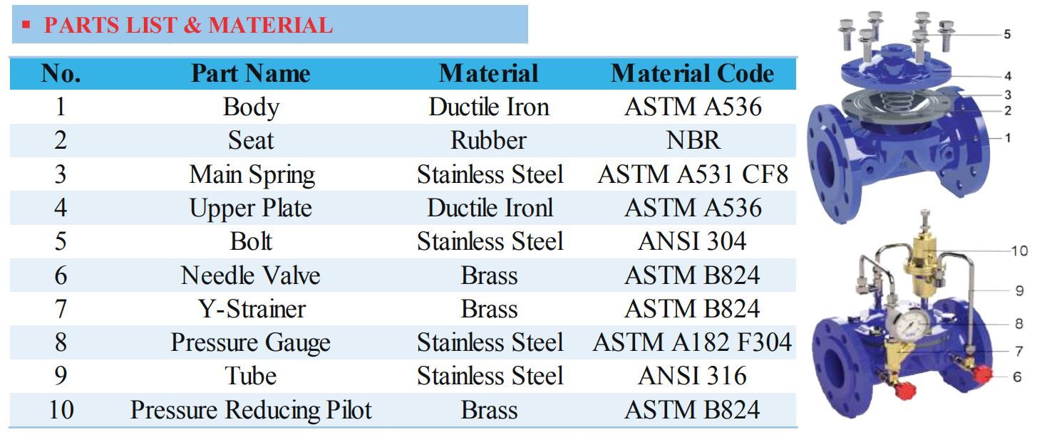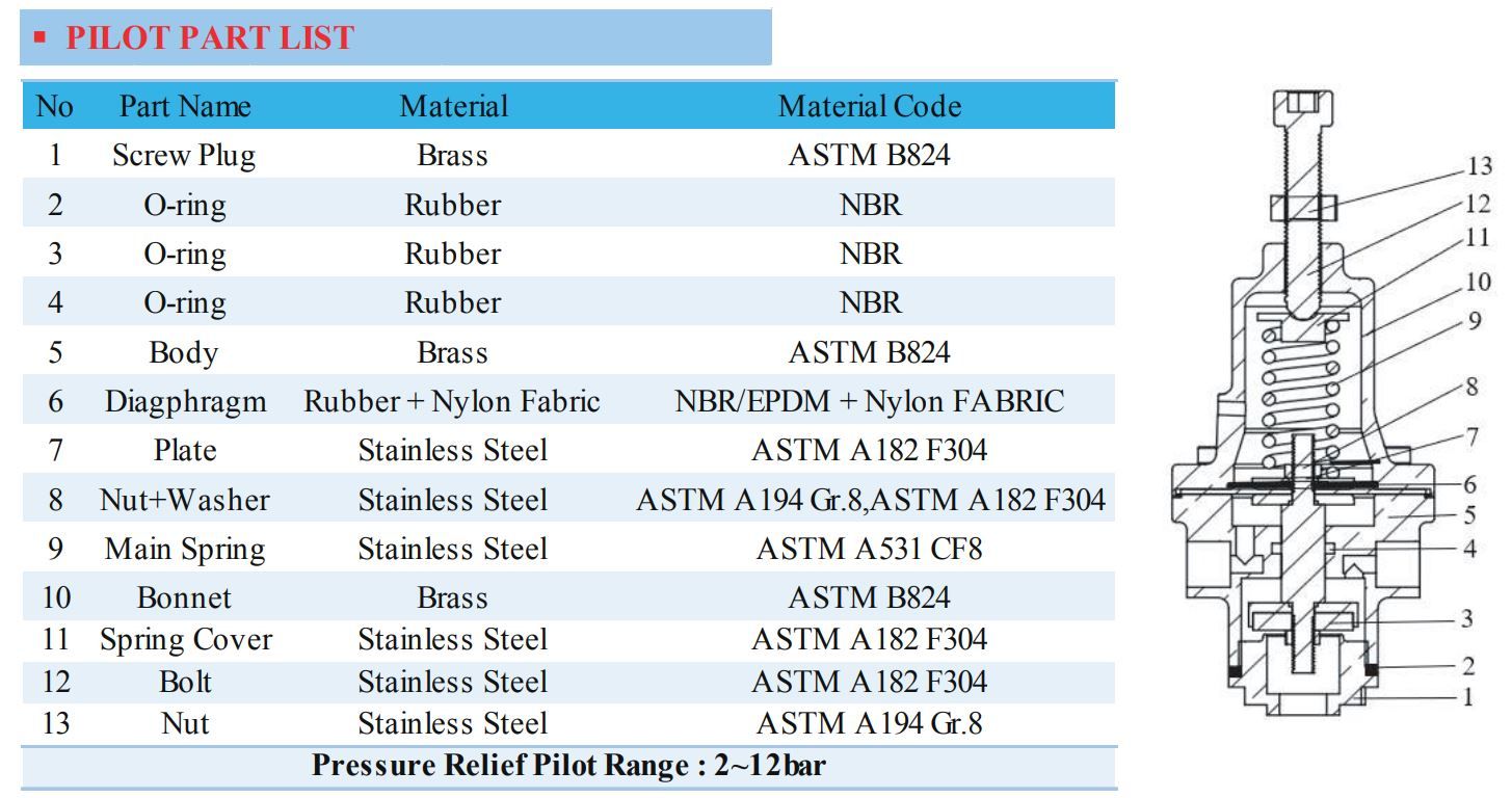 Cả van chính và bộ Pilot đều sử dụng vật liệu cao cấp như gang dẻo, inox và đồng thau, giúp tăng tuổi thọ và hiệu suất vận hành trong nhiều điều kiện áp suất và nhiệt độ khác nhau.
