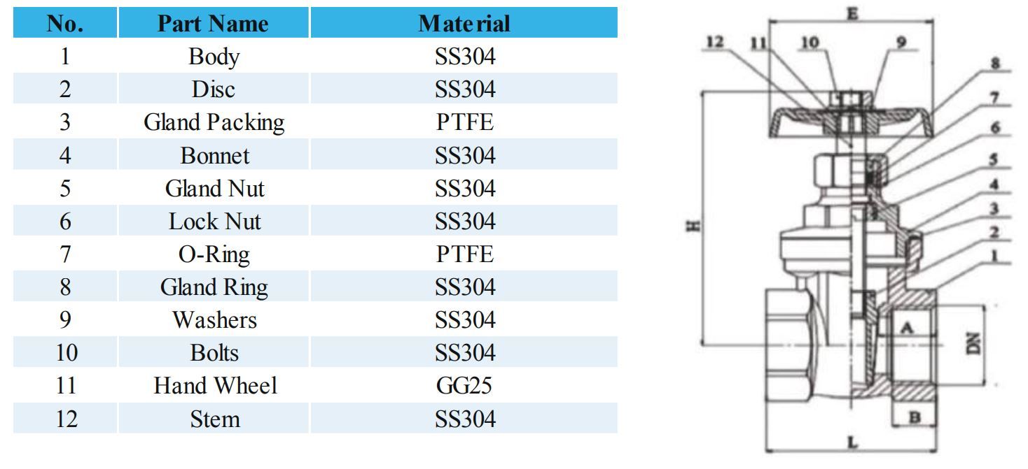 Van cổng ren Inox Robo được chế tạo từ các vật liệu chất lượng cao, chủ yếu là thép không gỉ SS304, đảm bảo độ bền, khả năng chống ăn mòn và hoạt động ổn định trong điều kiện môi trường và nhiệt độ khác nhau. Dưới đây là chi tiết các bộ phận cấu tạo nên van: