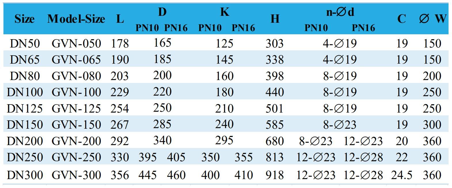 Van được sản xuất với đa dạng kích thước từ DN50 đến DN300, phù hợp cho nhiều hệ thống đường ống khác nhau. Thông số kích thước chi tiết như sau: