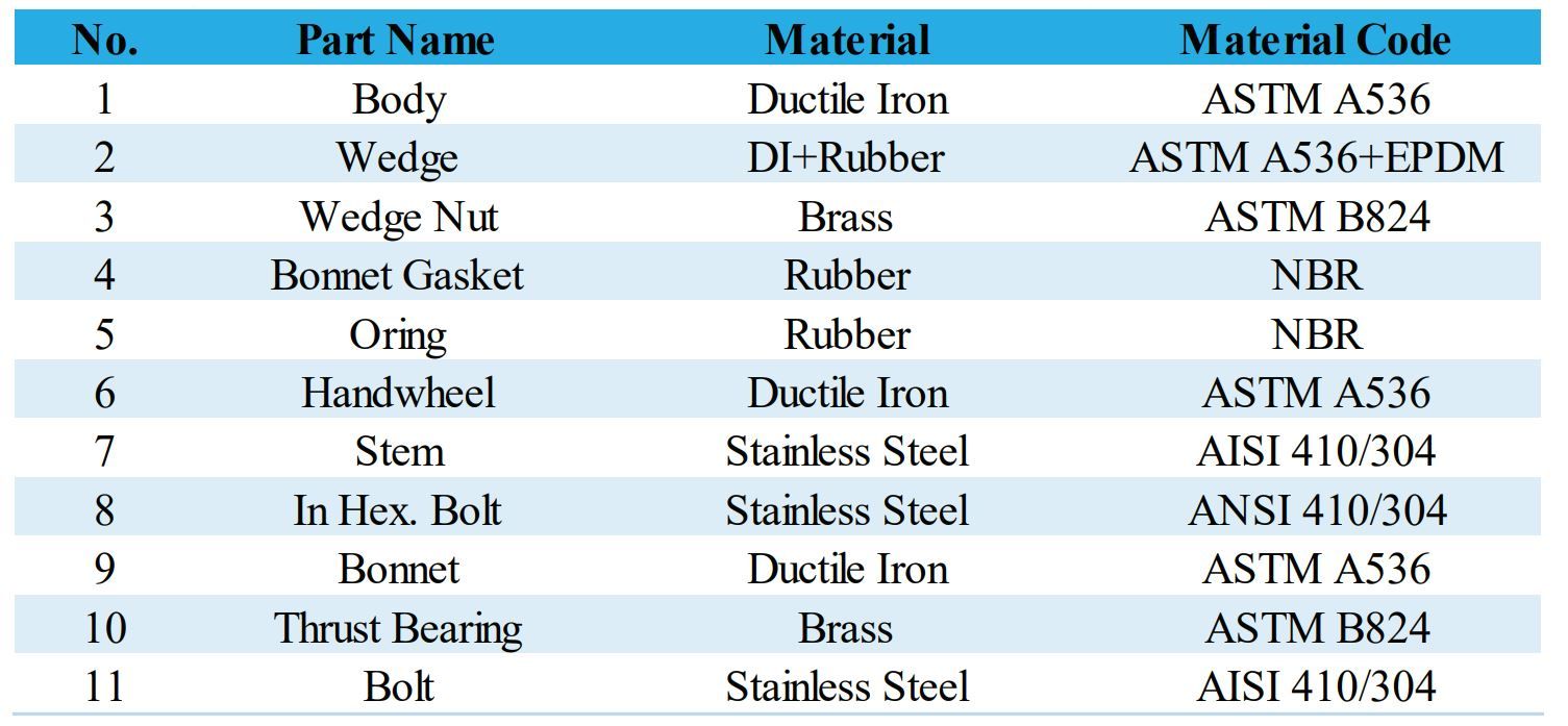 Van cổng ty chìm tay quay Robo được chế tạo từ các vật liệu chất lượng cao, đảm bảo khả năng vận hành bền bỉ và chống ăn mòn hiệu quả. Dưới đây là bảng chi tiết các bộ phận và vật liệu cấu thành: